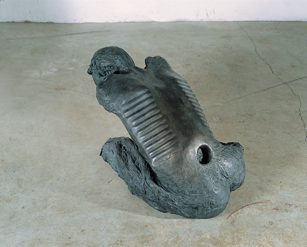 This work is a bronze sculpture of a collapsed figure curled up in a childlike position. The sculpture is a hybrid; it is half figurative and half molded as a squat latrine — the kind used in the Near and Far East and dubbed