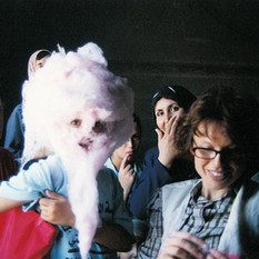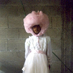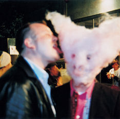 I offered the audience to let me cover their heads in warm and soft extrusions of cotton candy. This material is easy to sculpt and mold, the mask designs varied slightly. I created them on the spot while talking to the person, taking requests of specific designs. The less brave audience members that gathered around the mask bearers ate their way through these enlarged soft helmets. Melting was also a transformation that occurred and clung to the faces, like cobwebs.