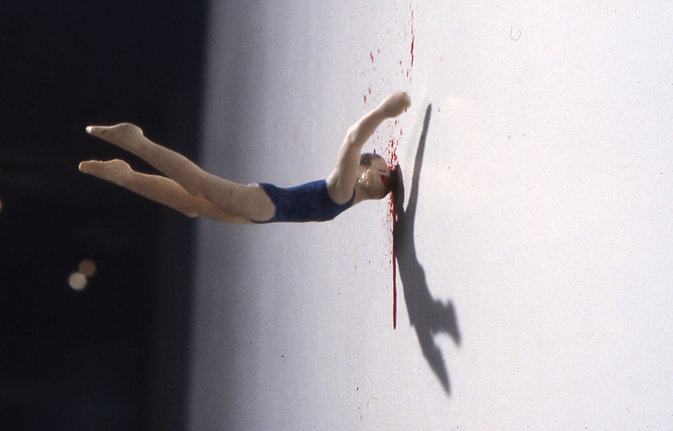 A small painted sculpture of a young swimmer that has hit a wall. The rim of a swimming pool is splashed with her blood spilling from her head. The blood can also be seen as flowing from between her legs.